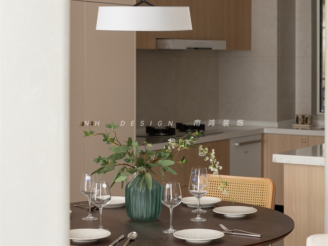 开放式餐厨区以承重柱为轴心展开了设计,延伸出的岛台既化解了结构限制,又巧妙拓展出备餐区、早餐吧等实用功能。不加阻隔的联通布局让自然光在空间内自由流动,亲友共聚时,烹饪、用餐与声声谈笑皆成一体。