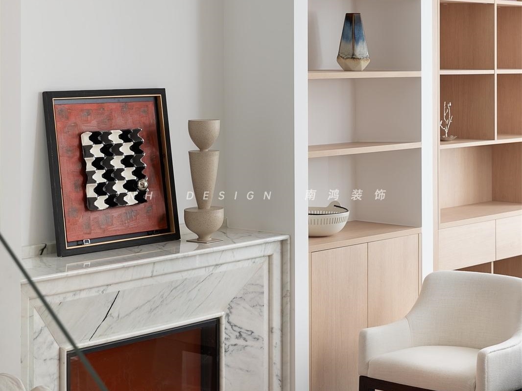 客厅包容了主人的办公区,并通过整墙书柜与壁炉的搭配,实现阅读、休闲、社交等多重功能,视线在横向维度上同步得到延展。