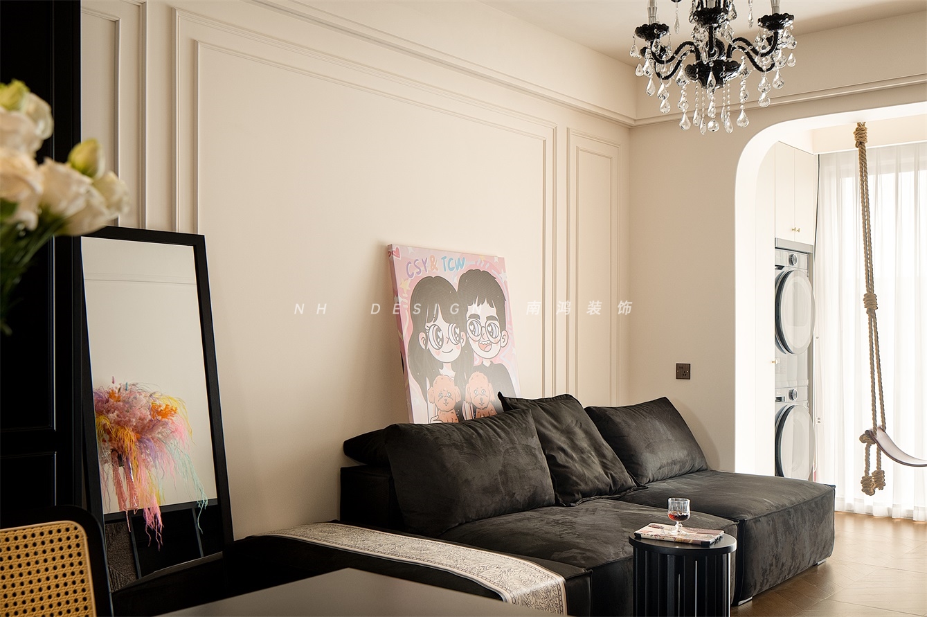 客厅舍弃了传统电视机的模式,取而代之的是一排黑色中古矮柜,既方便日常收纳,又散发出经久不衰的摩登质感。墙面留白,佐以线条勾勒,顶面配水晶吊灯,浓郁了一室复古氛围。