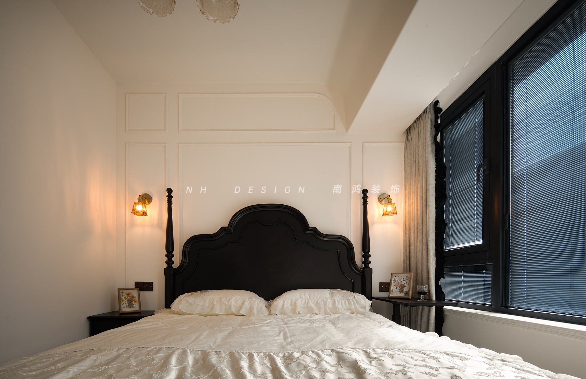 主卧选配黑色复古风的床具、床头柜,墙面同样以PU线条装饰,黄铜壁灯在奶油色墙面上投射出温暖光晕,渲染一方生活与艺术相融的优雅之景。