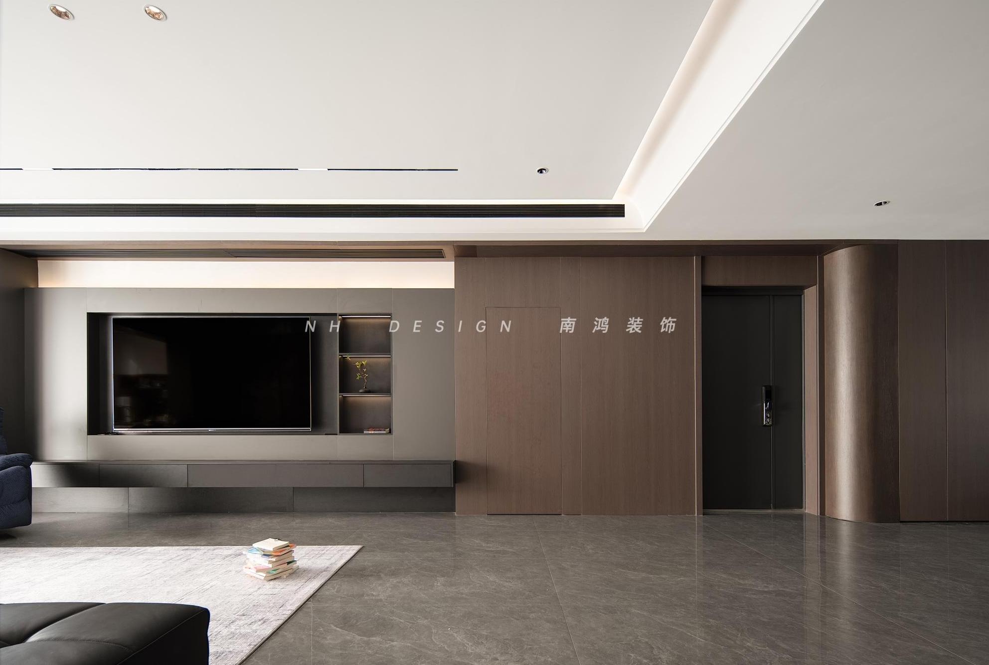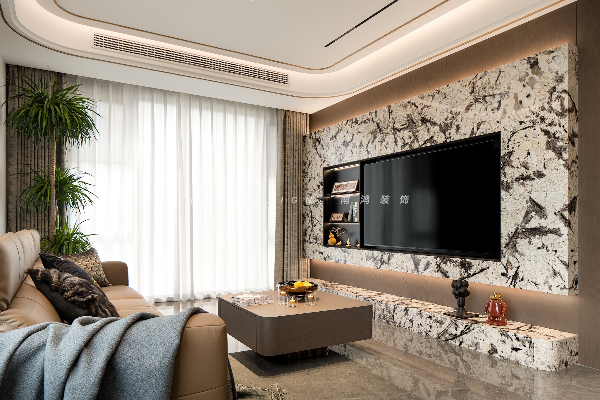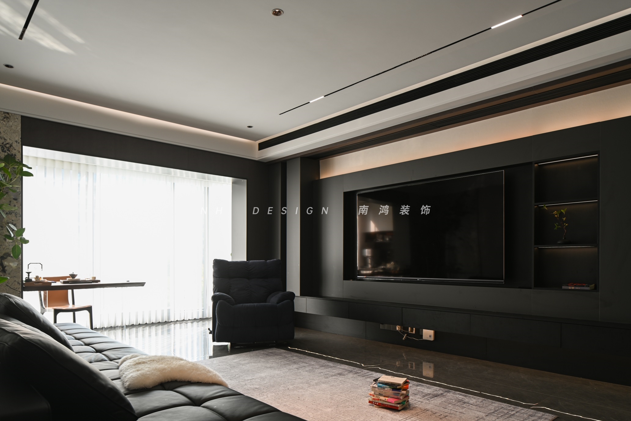 深色悬浮式矩形背景墙与电视柜同构为有机整体,形成一方稳重的视觉锚点。隐藏式灯带与顶面的点线光源组成室内照明系统,让空间在功能与氛围模式间可以自如切换。