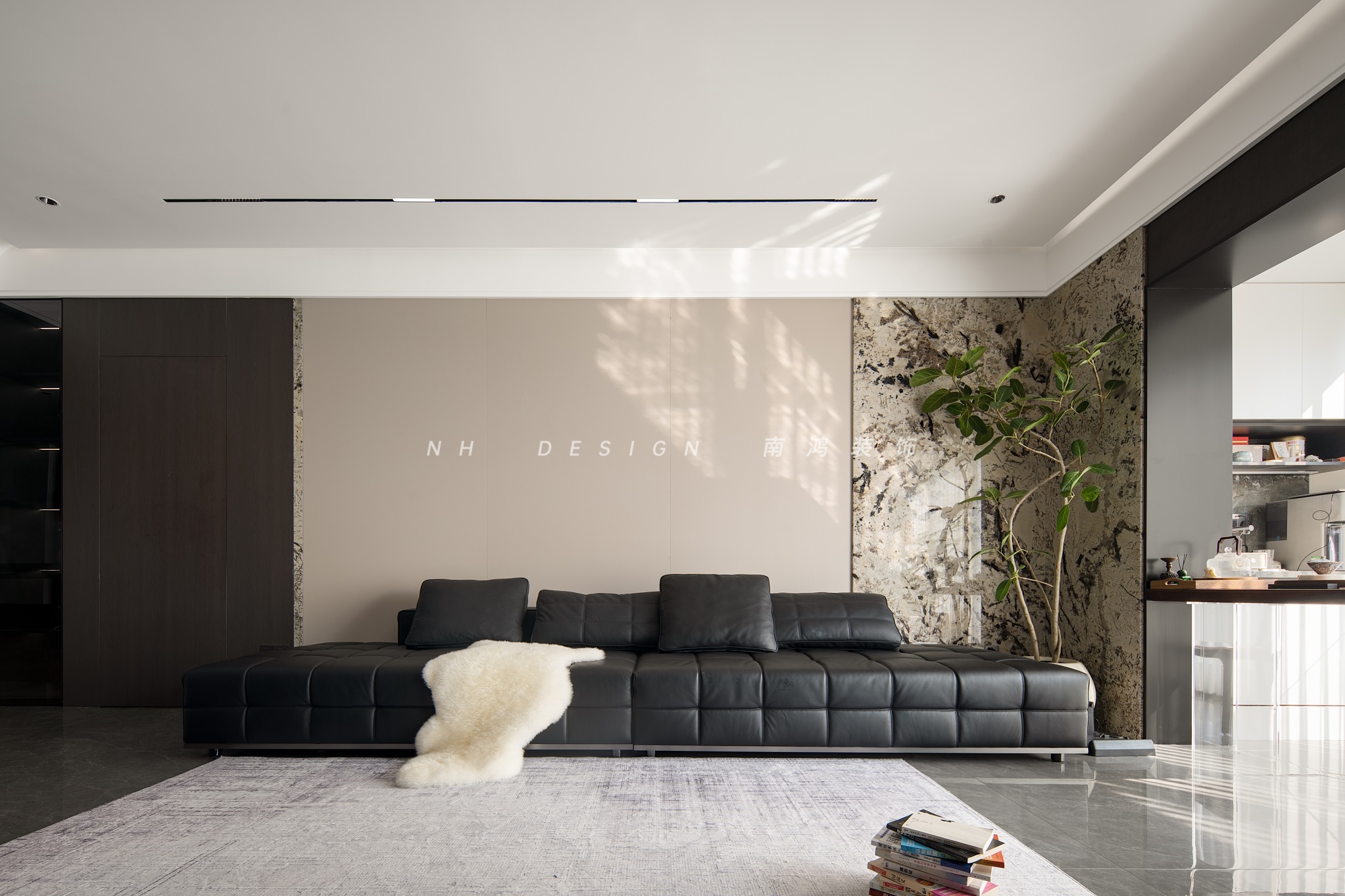 客厅以经典的意式笔法,构筑深与浅、理性与温度的平衡。墙面铺陈硬包、石材,利落线条语言带来清爽之感。精选黑色直排沙发,体型流畅饱满,有力烘托时尚商务氛围。